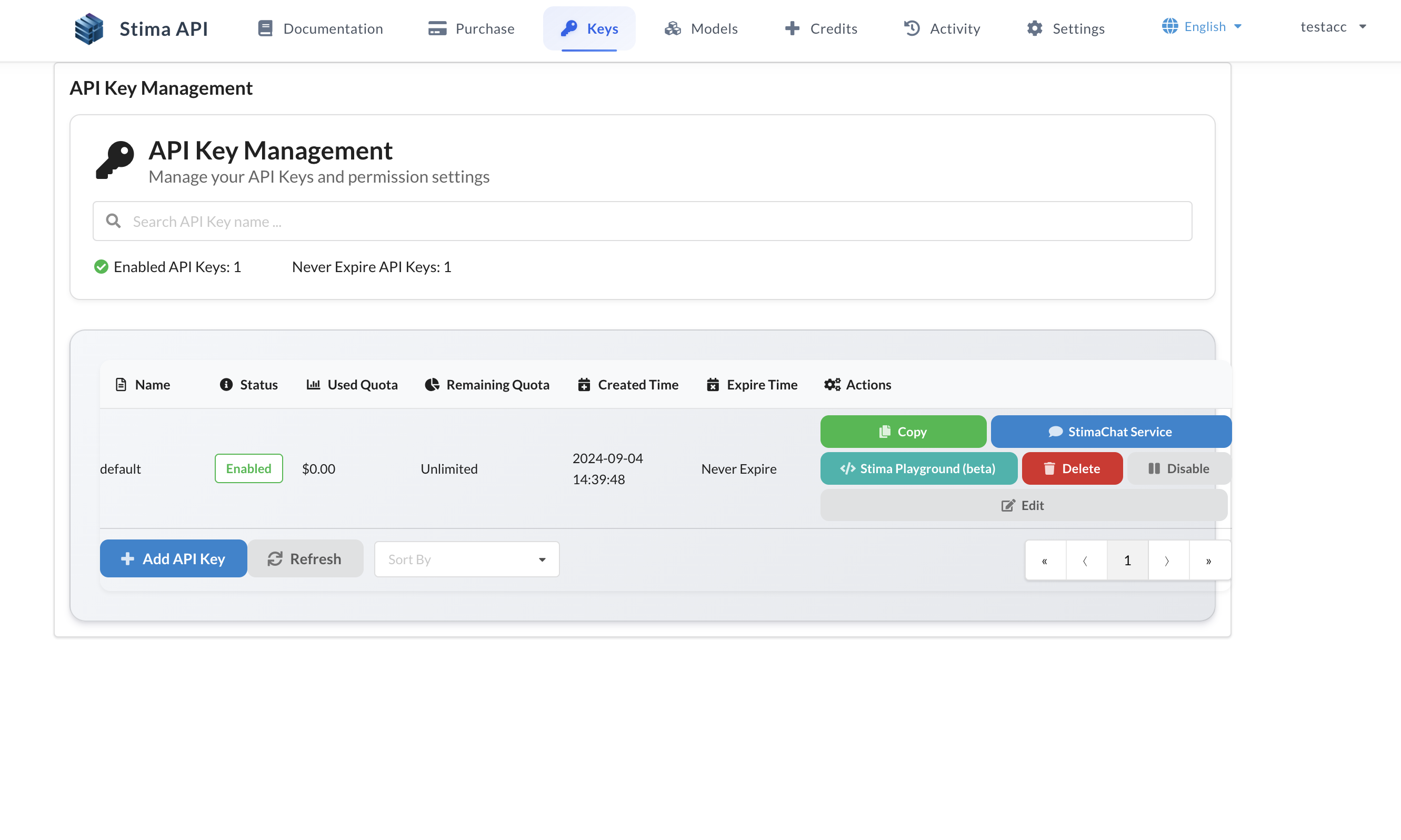 Once you log in and create an API Key, each key will have a blue [Chat Service] button next to it. Click this button to use the corresponding API Key for chatting.